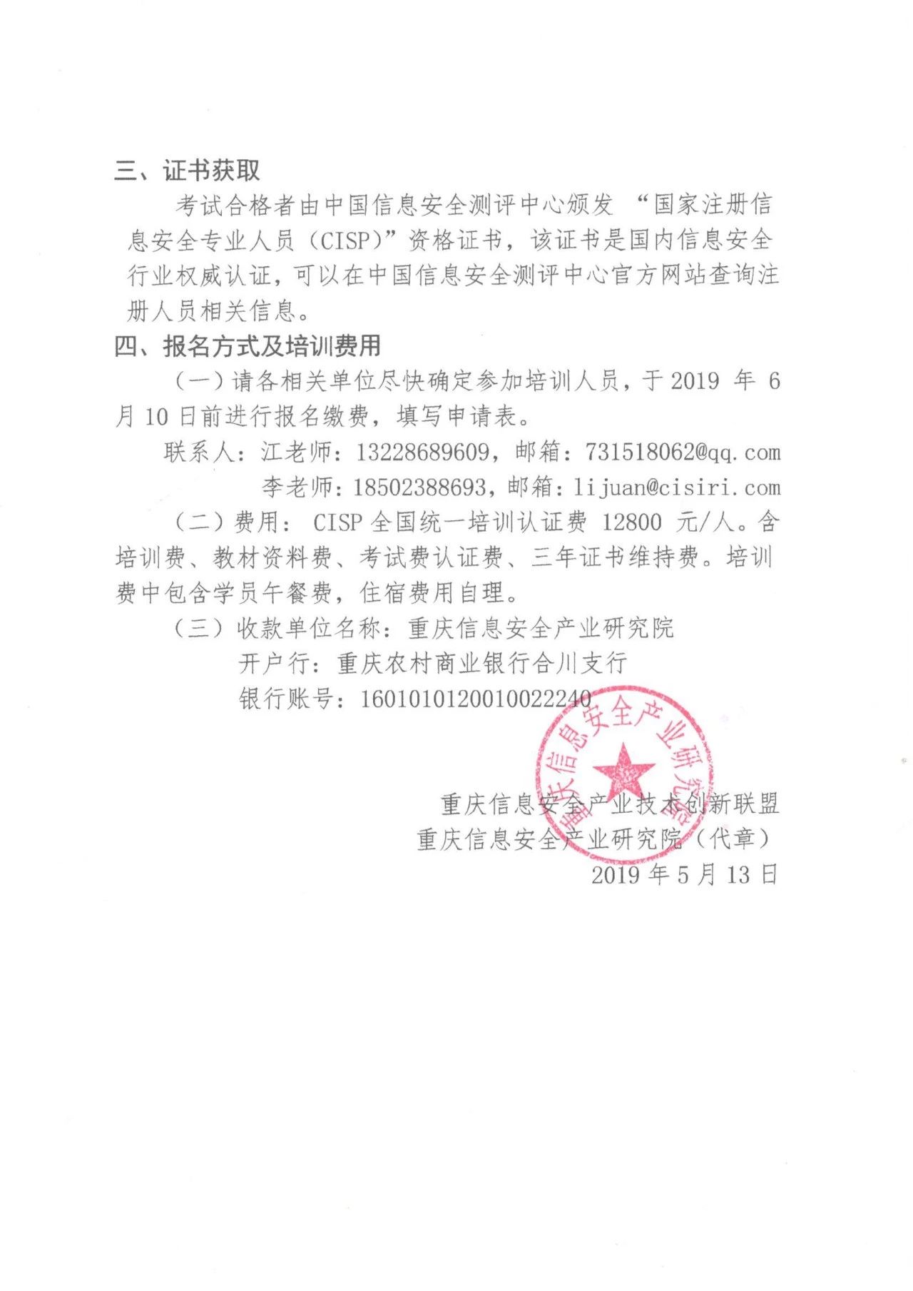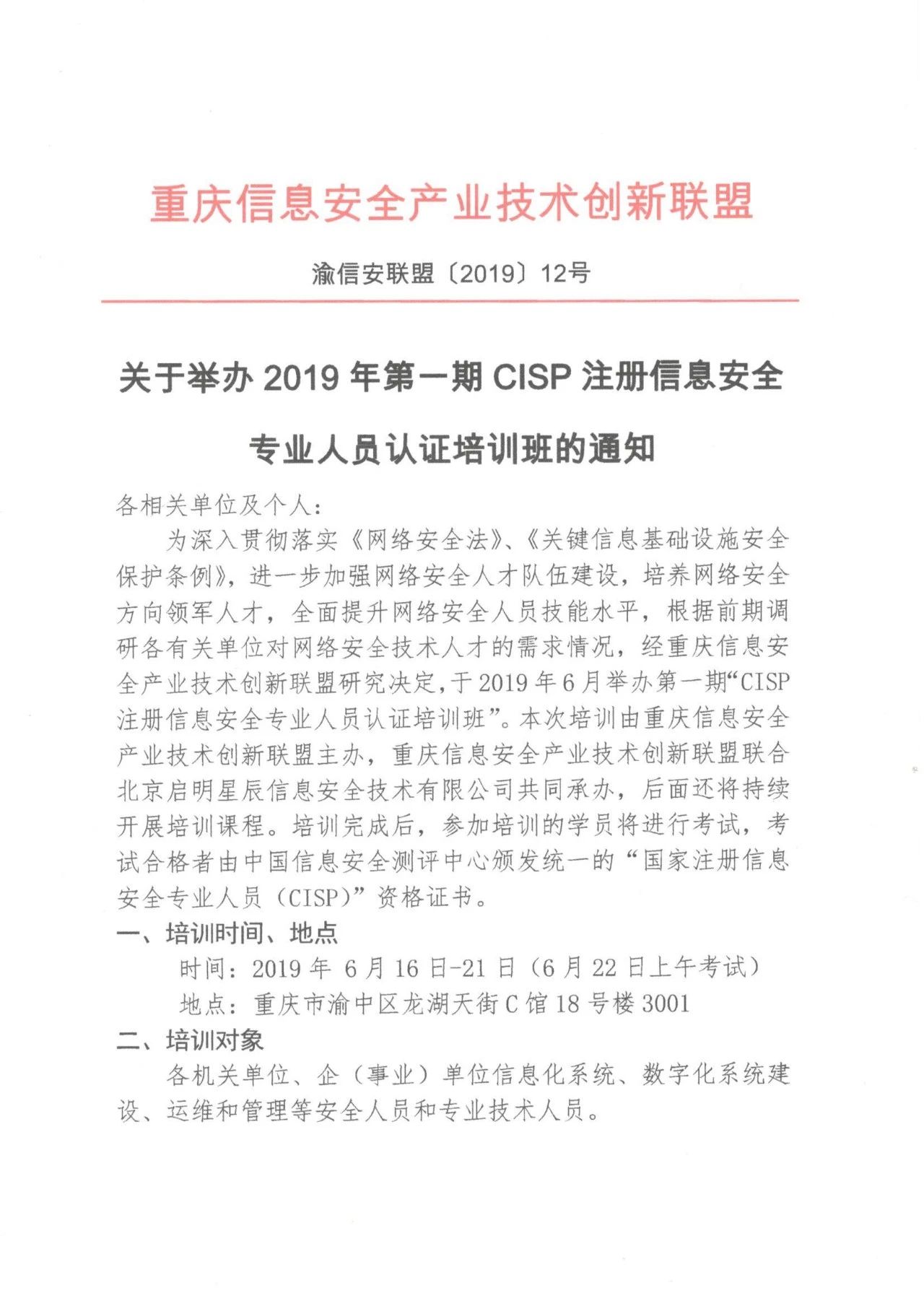 关于举办2019年第一期CISP注册信息安全专业人员认证培训班的通知