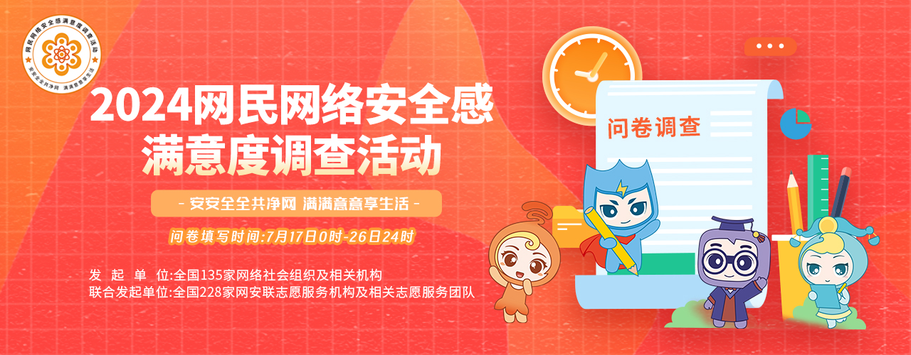 网民网络安全感满意度调查活动是一个公益性网络安全社会调查活动,自2018年开始每年举办一届。活动采取线上问卷调查方式开展,网民可在每年的样本采集期间通过参与答卷,写下上网用网过程中的感受、评价、建议及意见,是广大网民表达诉求和心声的绿色通道。2024调查活动由全国135家网络社会组织及相关机构发起,全国228家网安联志愿服务机构及相关志愿服务团队联合发起,各级党政有关部门、企事业单位、科研院所、高校、社会组织、志愿服务团体、媒体等支持。