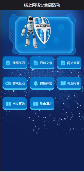 配合开展网络安全宣传周活动,提供课程学习、知识百科、答题竞赛、互动游戏等功能模块。课程学习通过动画视频形式讲解网络安全相关的基本知识和法律法规等,提高网络安全防范意识;知识百科通过丰富的图文内容,通俗易懂地介绍常见安全手段的攻击与防范,提高群众网络安全防范技能;答题竞赛通过线上答题竞赛的形式有效检验并巩固网络安全防范知识;互动游戏将网络安全知识普及与轻松活泼的游戏体验相结合,在娱乐中学习网络安全知识。
